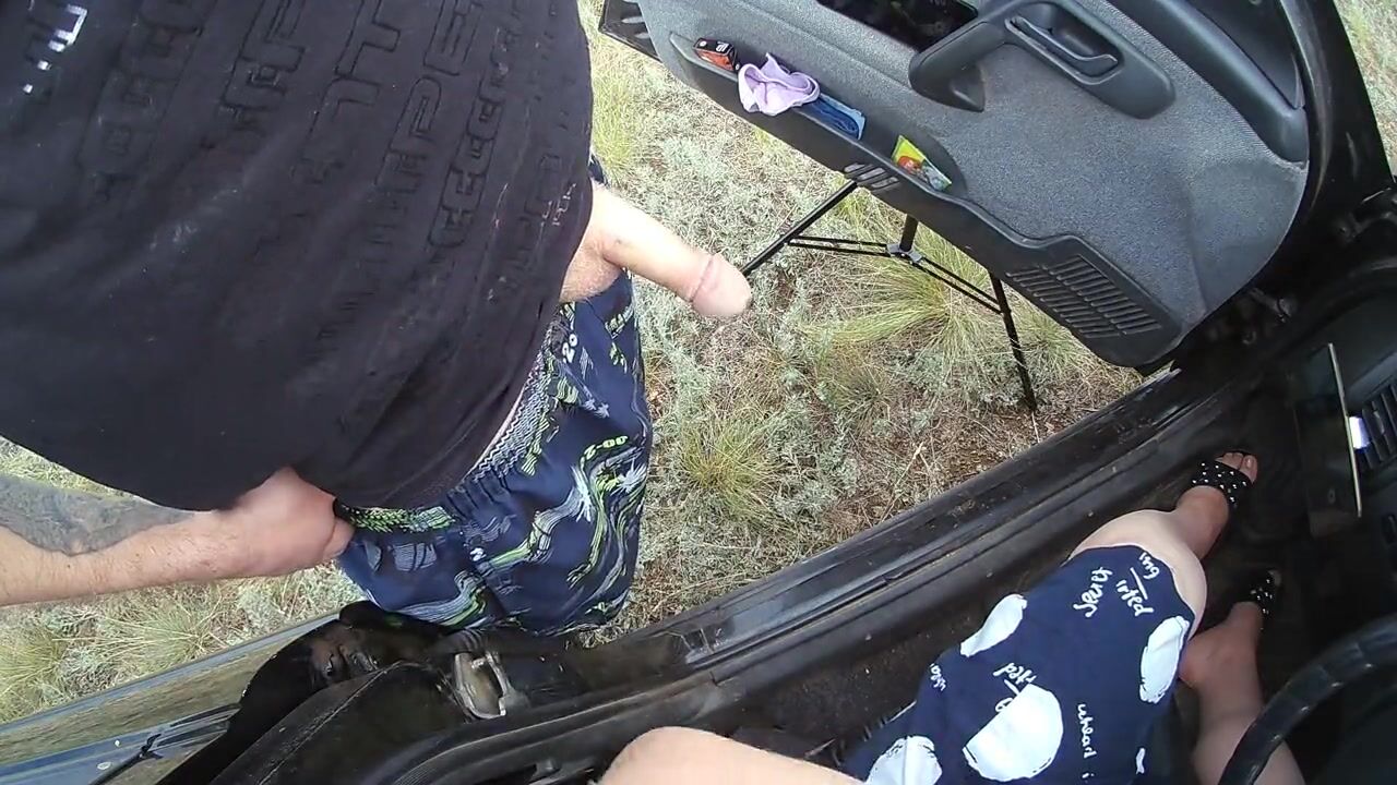 the bitch sits in the car and jerks off my dick in nature until I cum